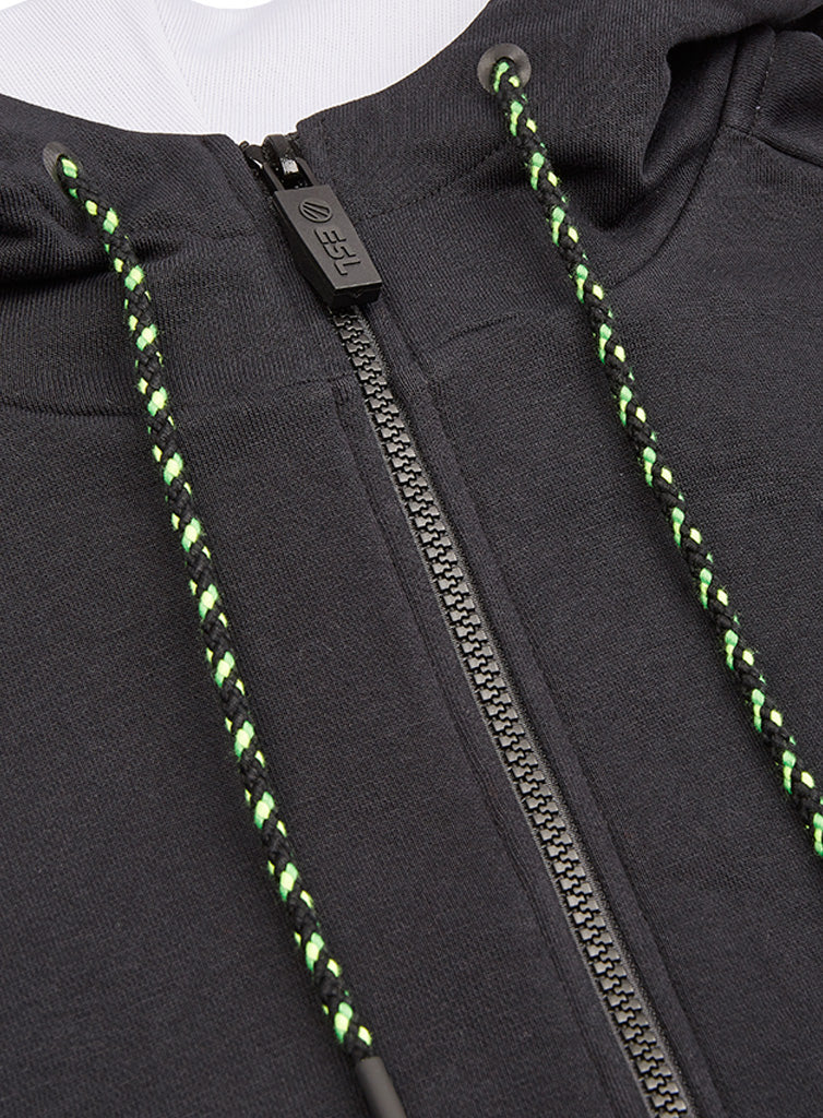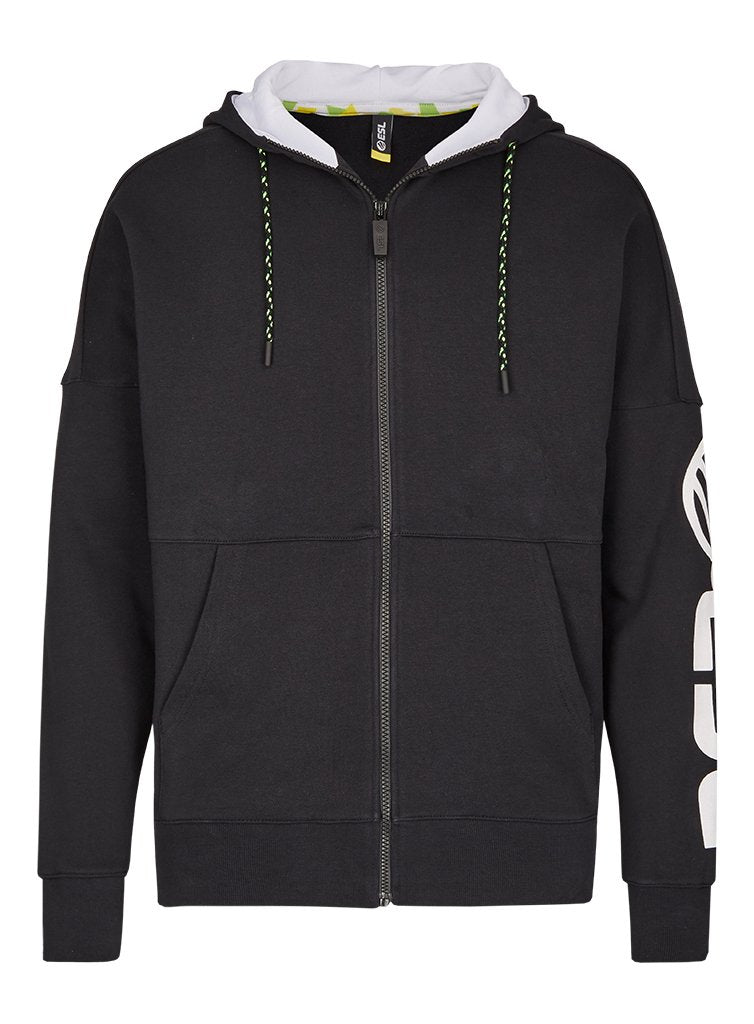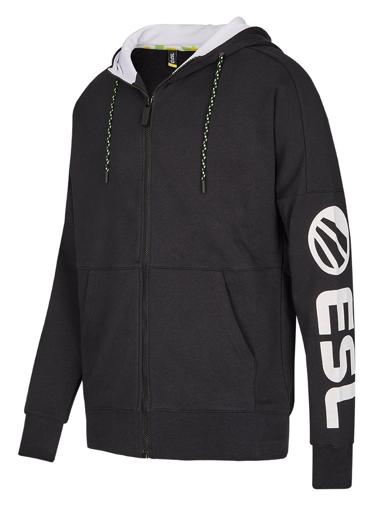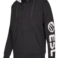 The ESL Premium Zip Up Hoodie Sleeve Print black is made of a special fleece fabric and super comfortable through its stretchability and softness. Features multicolour pattern on hood drawstrings. The big ESL logo screen print is a bold and cool statement.